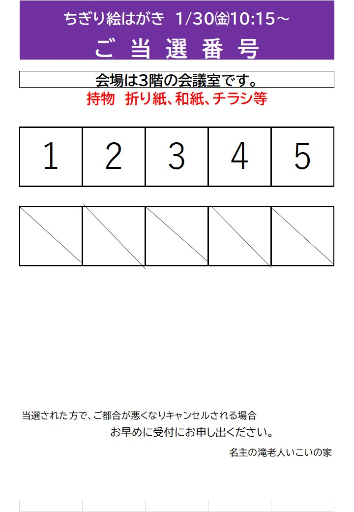 1月30日開催のちぎり絵はがき抽選結果を発表させていただきます。