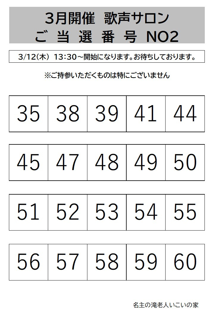 3月開催歌声サロンの抽選結果を発表させていただきます。