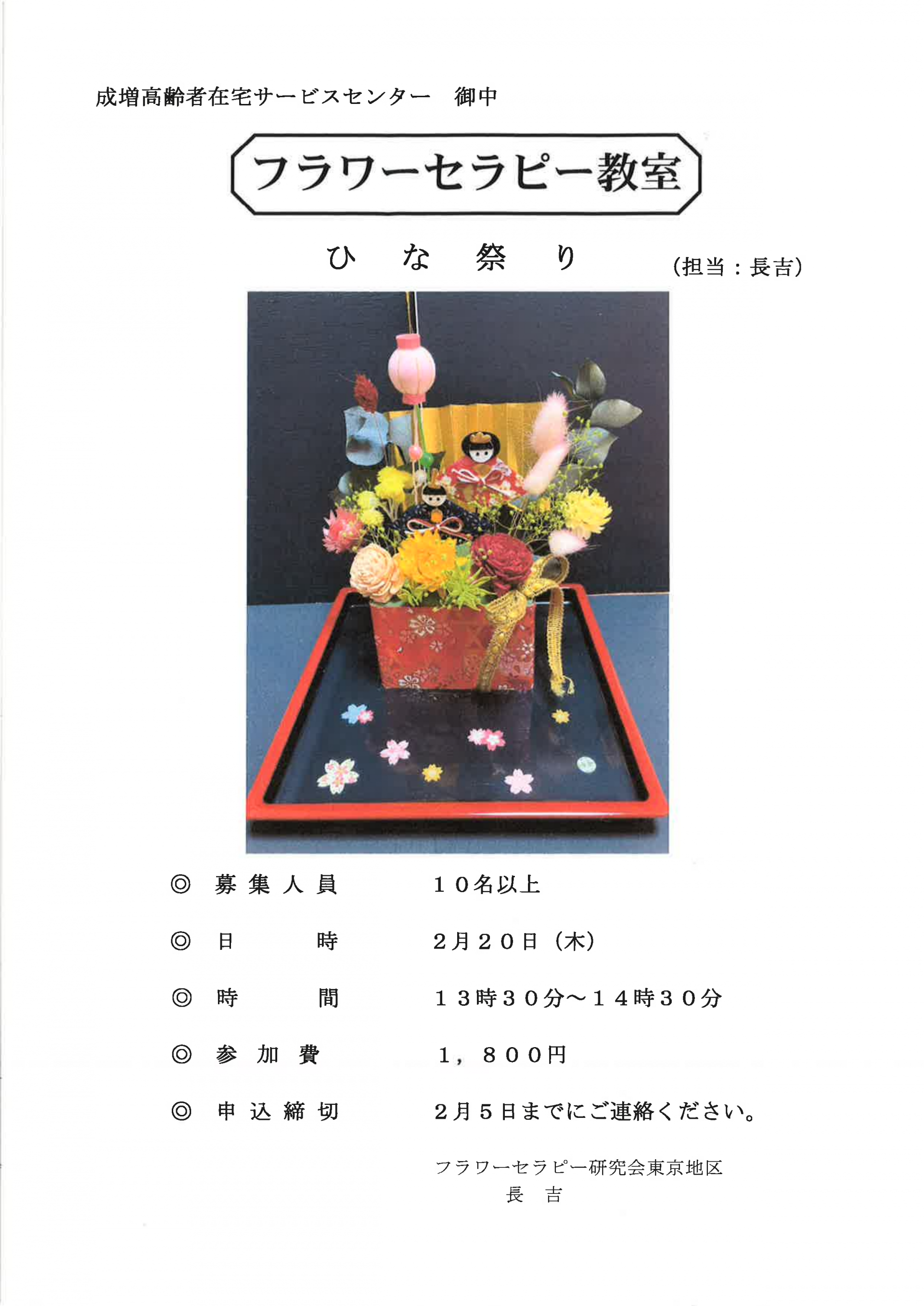 2025.02.01 活動報告 【成増デイ】2月のフラワーセラピー Tweet シェアする こんばんは!成増高齢者在宅サービスセンターです。 いつも当ホームページをご覧いただきありがとうございます! 来月の【ひな祭り】にピッタリな物を作成します。 前の記事 2025.02.01 活動報告 【成増デイ】2月のヘアカットサービス 次の記事 2025.02.01 活動報告 【成増デイ】2月のプログラム表 一覧へ戻る