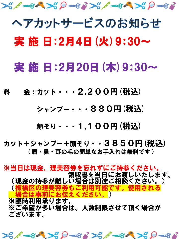2025.02.01 活動報告 【成増デイ】2月のヘアカットサービス Tweet シェアする こんばんは。成増高齢者在宅サービスセンターです。 いつも当ホームページをご覧いただきありがとうございます。 お早めに予約してくださいネ(^^)/ 前の記事 2025.02.03 活動報告 ☆成増デイ 節分!鬼退治ゲーム☆ 次の記事 2025.02.01 活動報告 【成増デイ】2月のフラワーセラピー 一覧へ戻る