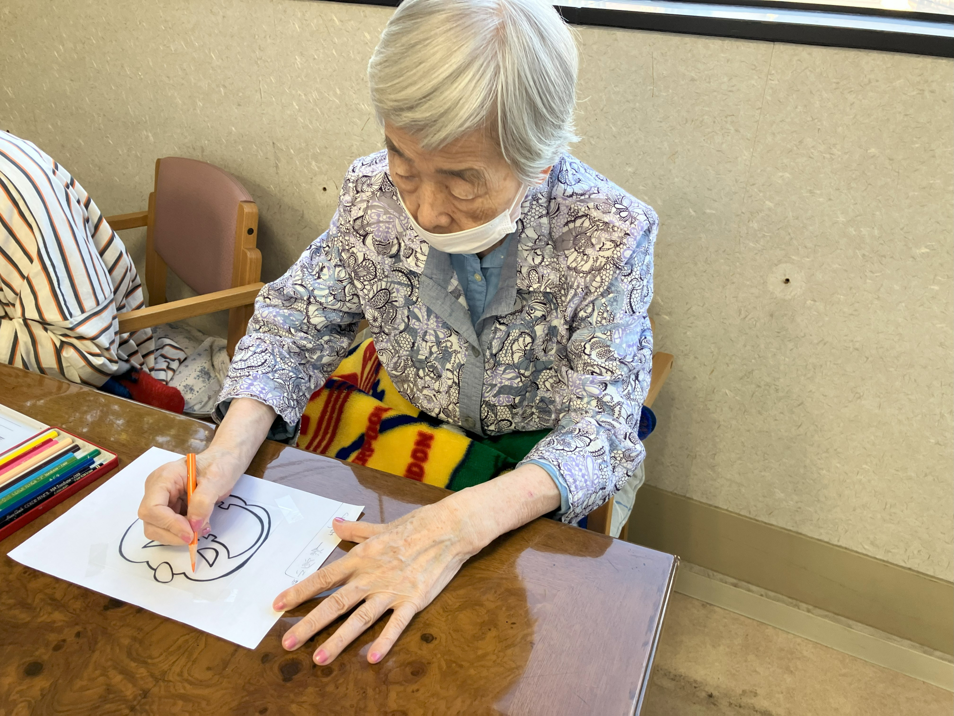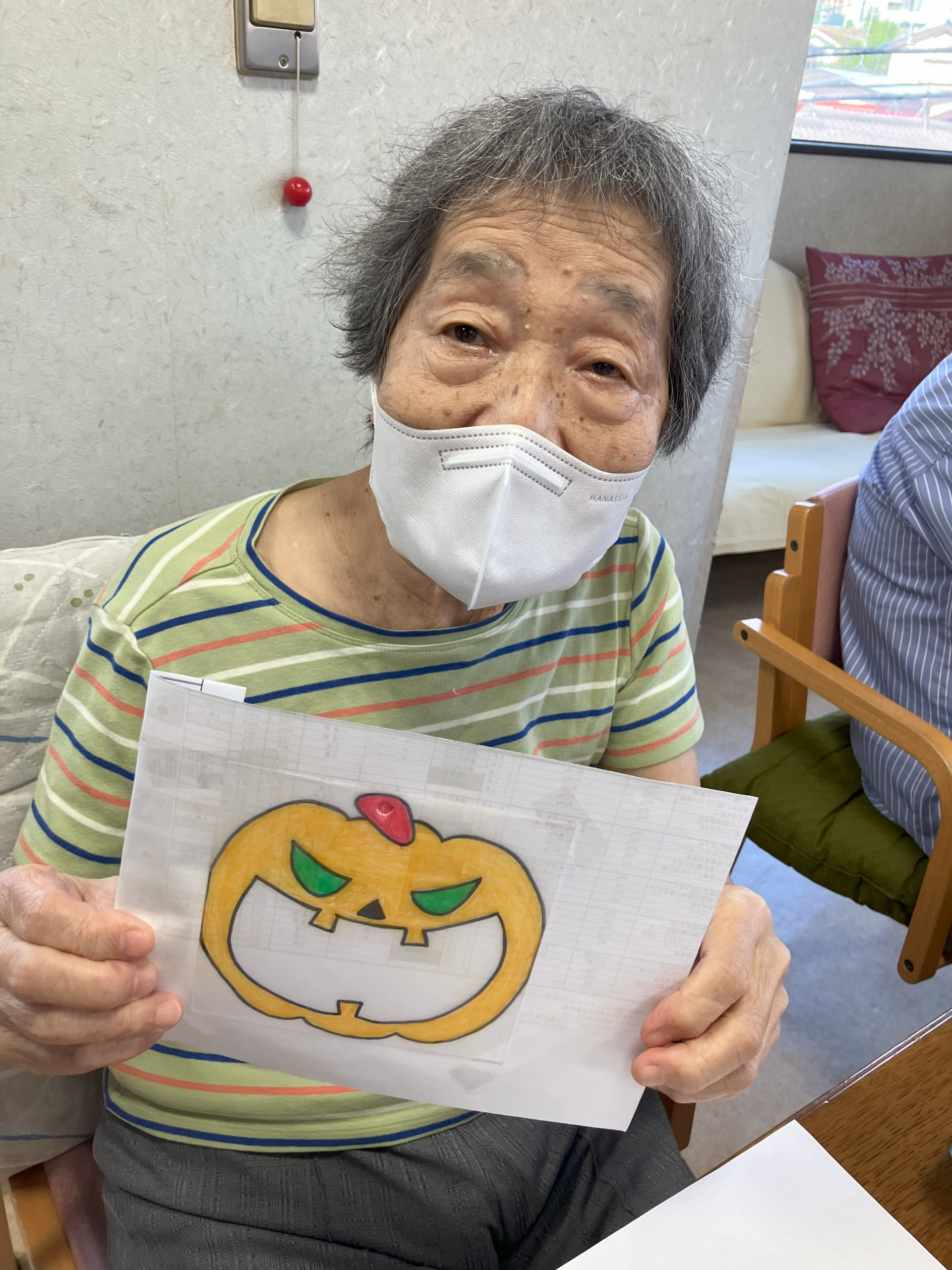 先日は制作でした、まずはカボチャのぬり絵をしました。