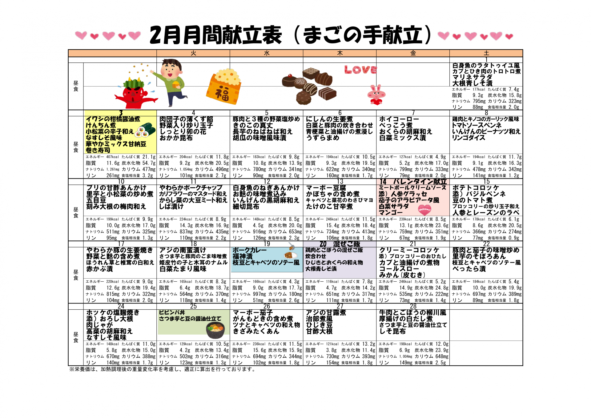 2025.02.01 活動報告 【成増優っくりデイ】2月の献立表 Tweet シェアする こんばんは~成増優っくりデイサービスセンターです。 いつも当ホームページをご覧いただきありがとうございます! 節分やバレンタインの特別メニューやビビンバ丼などがあります。 前の記事 2025.02.01 活動報告 【成増優っくりデイ】2月のヘアカットサービス 次の記事 2025.02.01 活動報告 【成増優っくりデイ】2月のプログラム表 一覧へ戻る