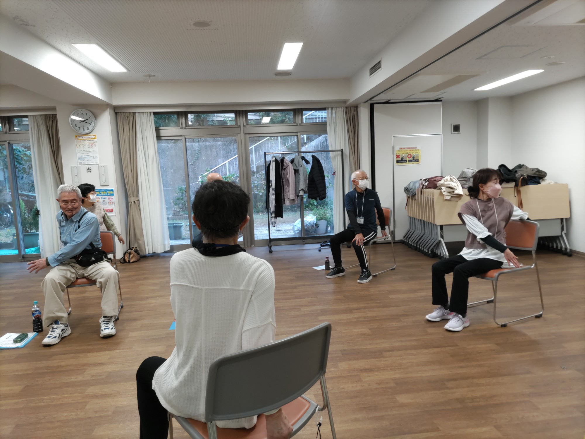 新宿いきいき体操のDVDを観ながらいきいきサポーター指導の下、20名くらいの利用者様と体操を行っています。