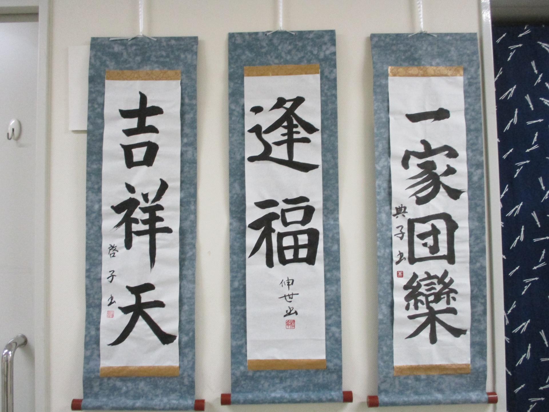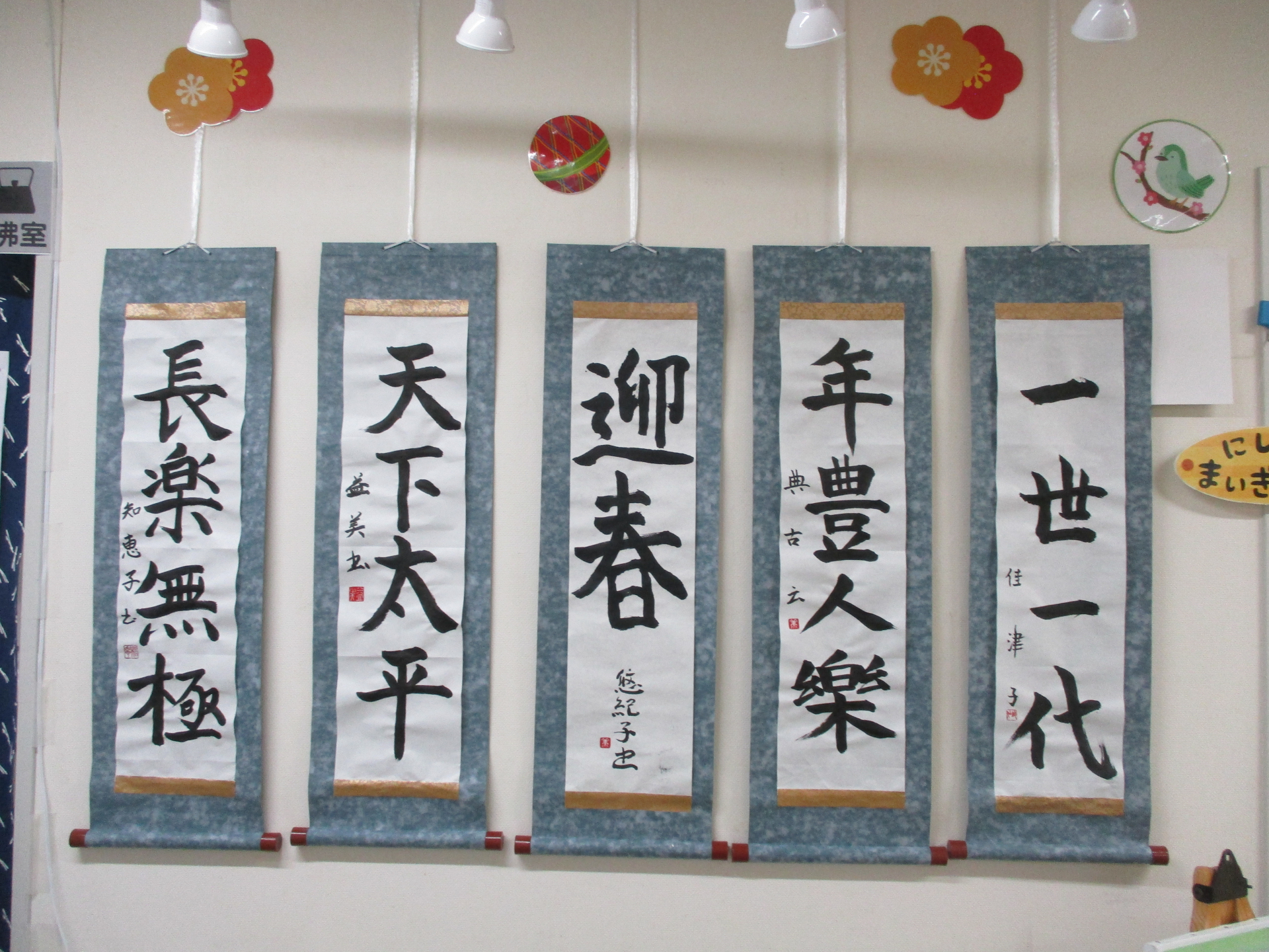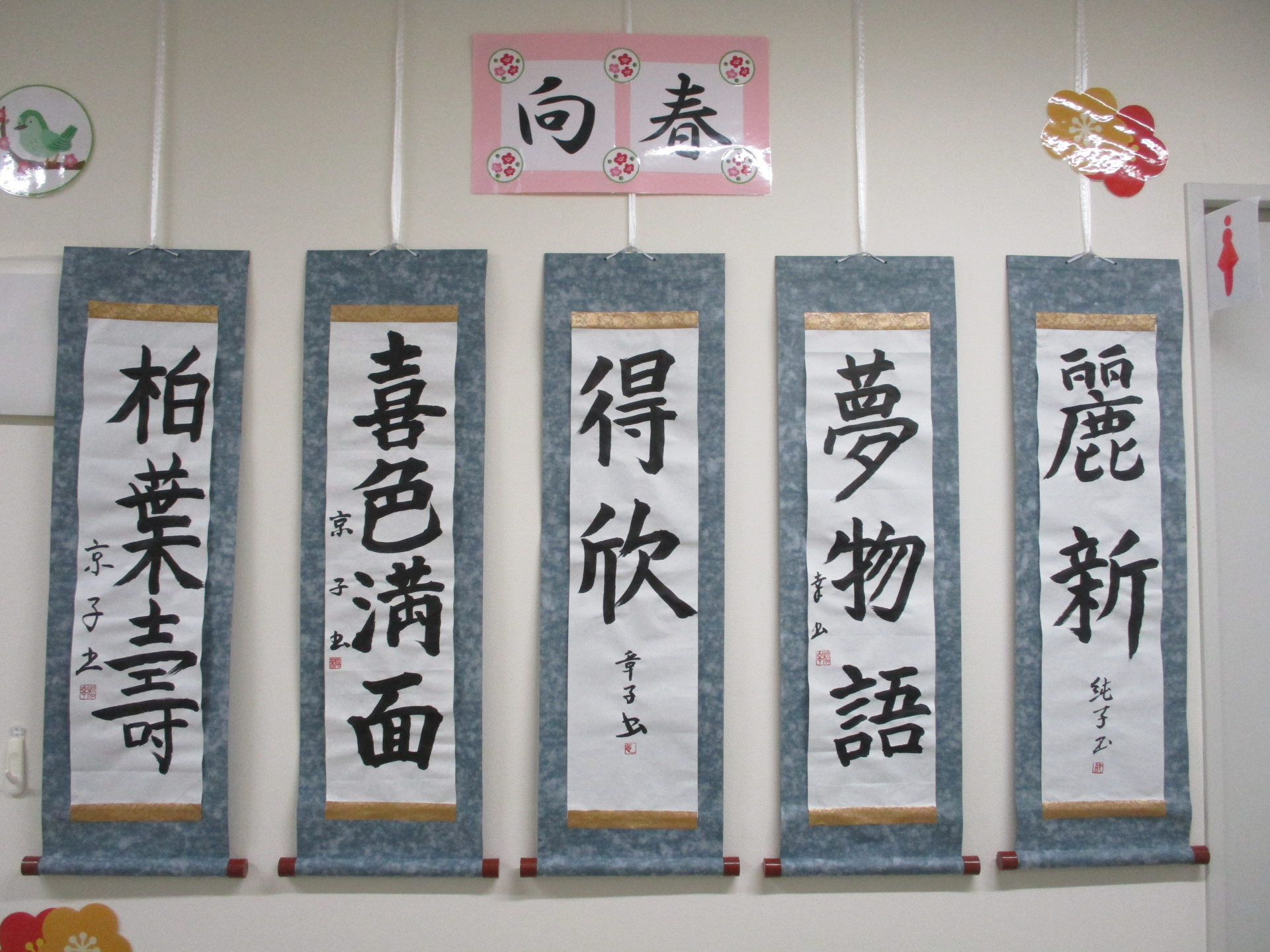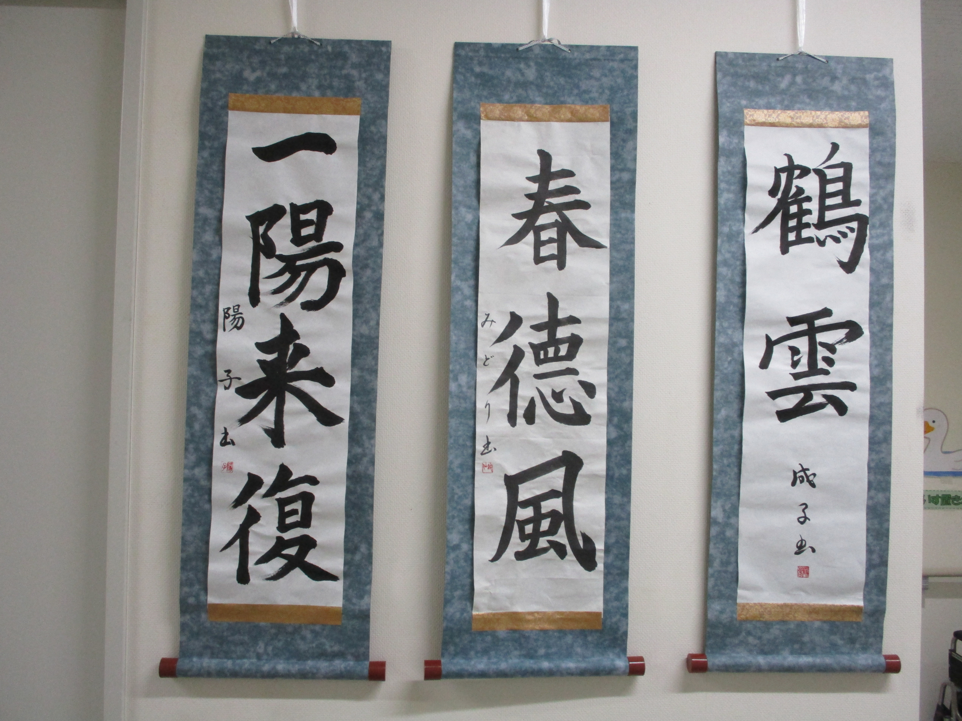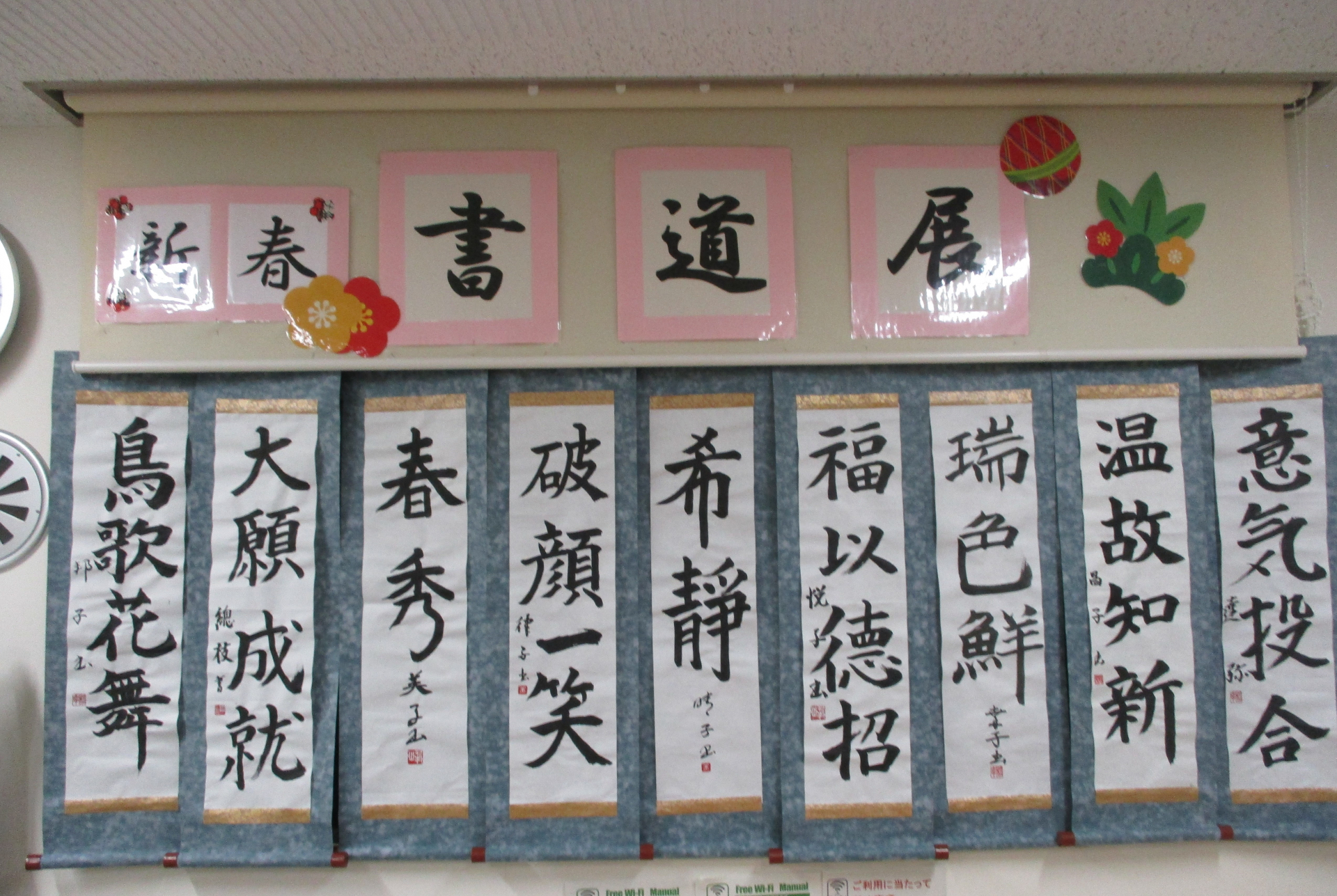 年始の1月4日から、事務所前から談話室にかけての廊下に作品を展示し、お正月を感じていただければとの思いで開催しています。