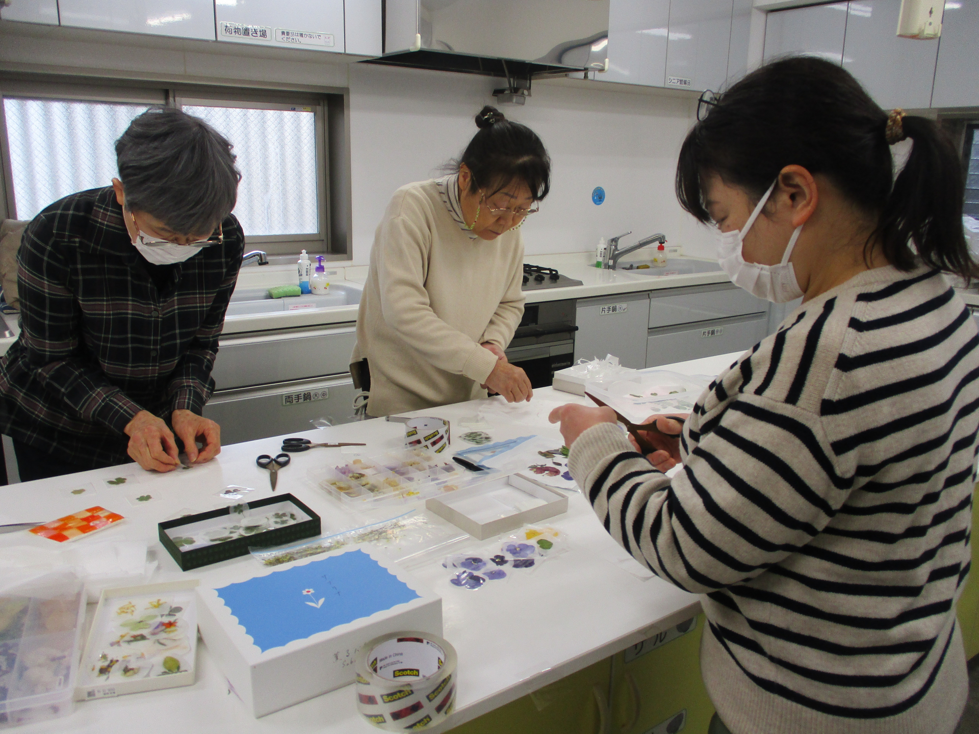 この日は、都合がつくメンバーだけの臨時招集で、押し花シールを作りました。