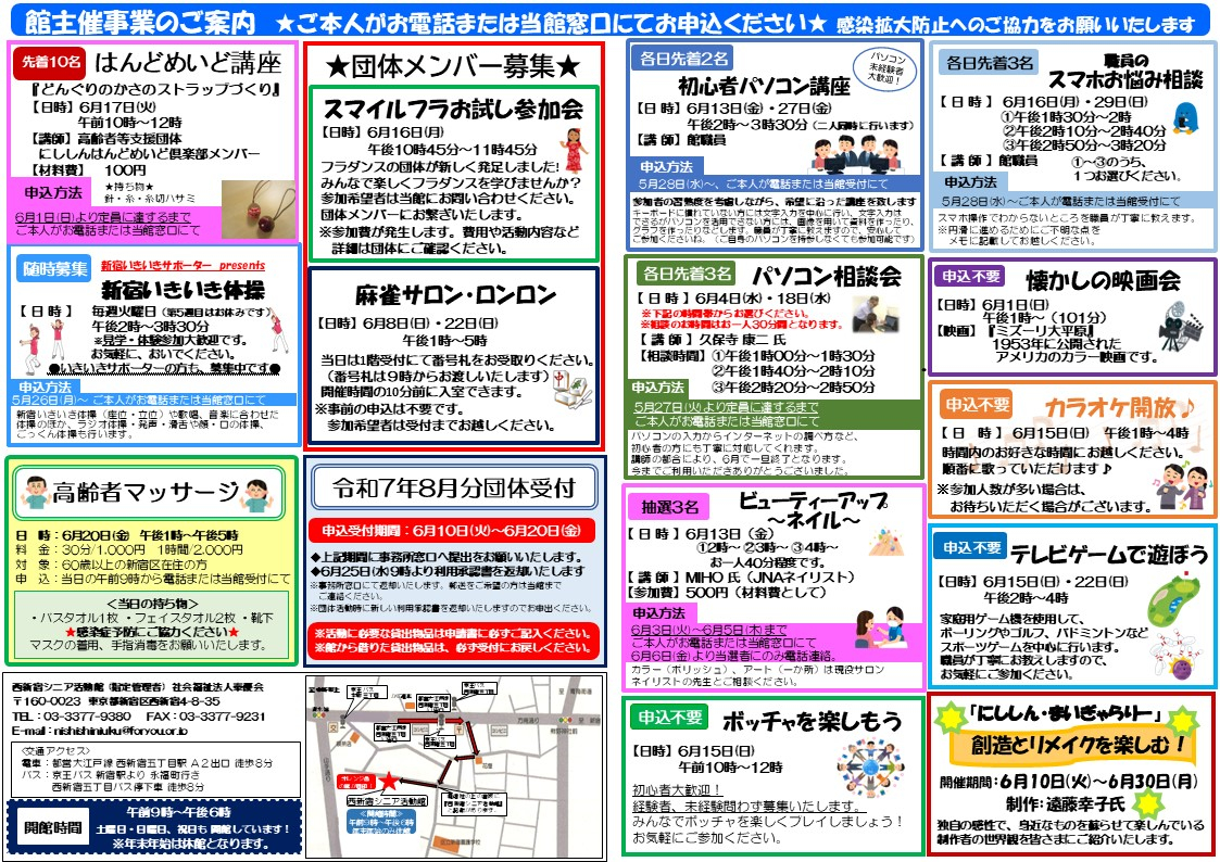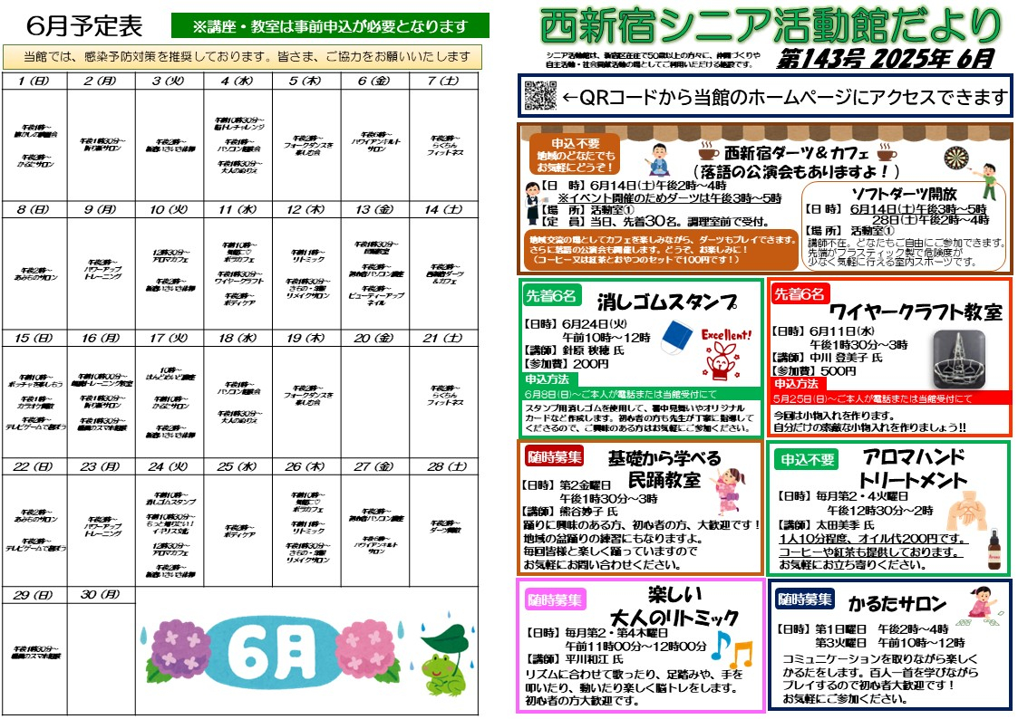 2025.05.25 お知らせ 西新宿シニア活動館 館だより 令和7年6月号発行のお知らせ Tweet シェアする 西新宿シニア活動館だより 令和7年6月号のご案内です。 講座等のご質問などございましたら、どうぞお気軽にお問い合わせくださいませ♪ 皆さまのご参加、お待ちいたしております。 一覧へ戻る