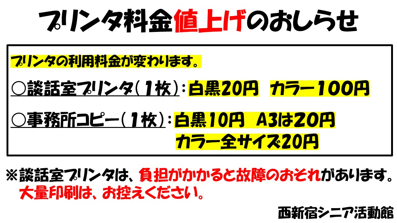 2025.06.10 お知らせ 談話室プリンタ復旧およびプリンタ料金値上げのお知らせ Tweet シェアする 談話室のPCを「Windows11」にアップグレードした影響で、プリンタの不具合が解消し、再度ご利用いただけるようになりました。これに伴って、印刷料金の値上げをいたしましたので、そちらも併せて、お知らせいたします。ご理解・ご協力のほど、何卒よろしくお願い致します。 一覧へ戻る