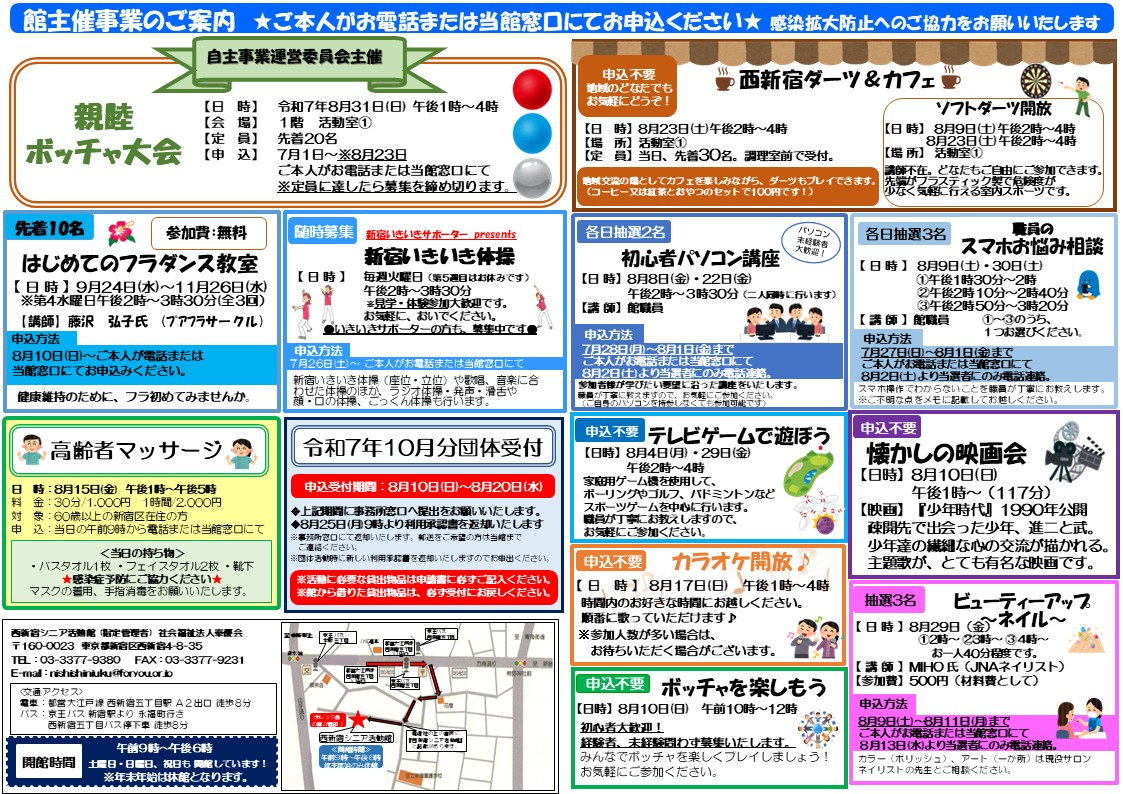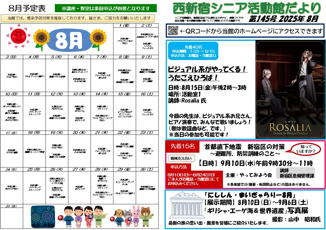 2025.07.25 お知らせ 西新宿シニア活動館 館だより 令和7年8月号発行のお知らせ Tweet シェアする 西新宿シニア活動館だより 令和7年8月号のご案内です。 講座等のご質問などございましたら、どうぞお気軽にお問い合わせくださいませ♪ 皆さまのご参加、お待ちしております。 一覧へ戻る