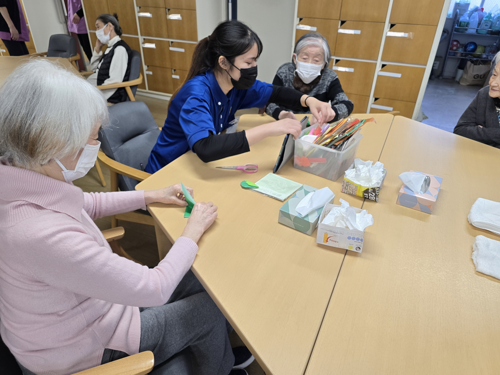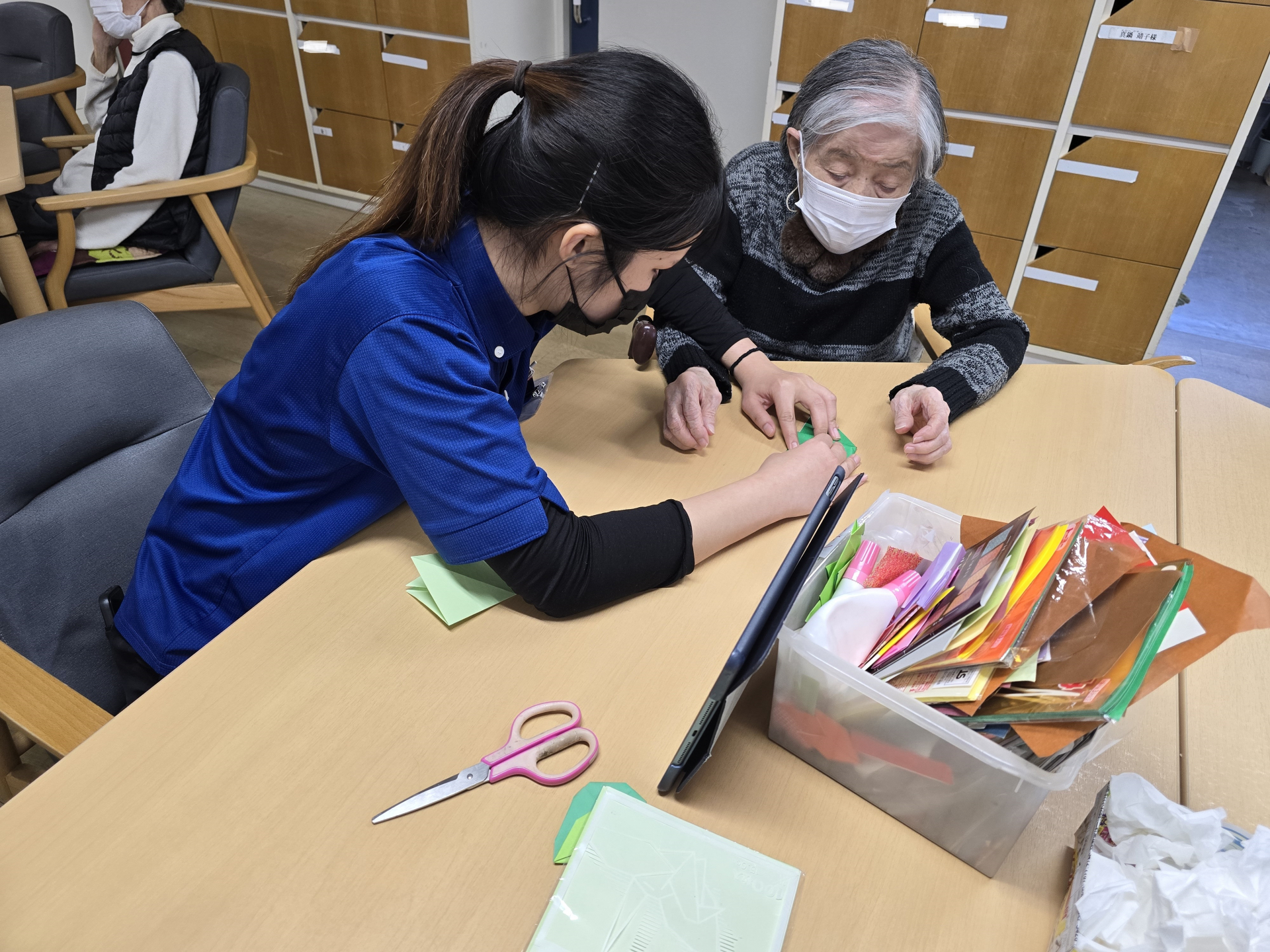 緑色で何を作っているでしょうか!!F職員に教えてもらいながら真剣に折っています!!