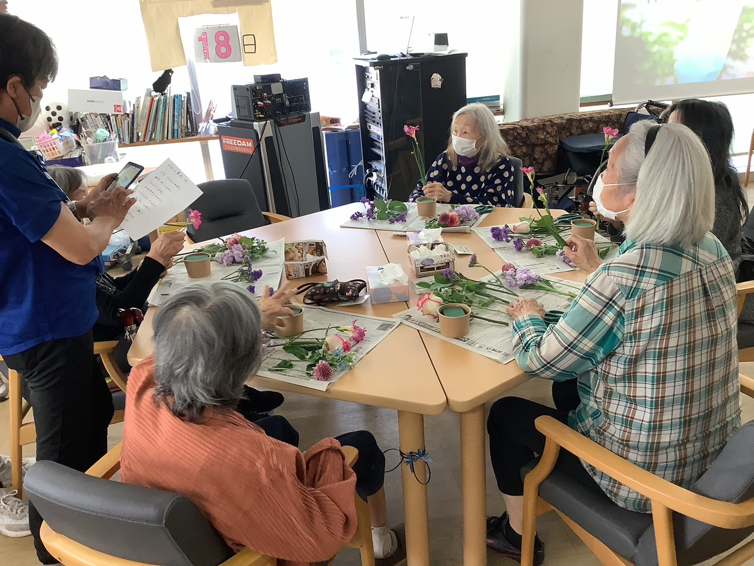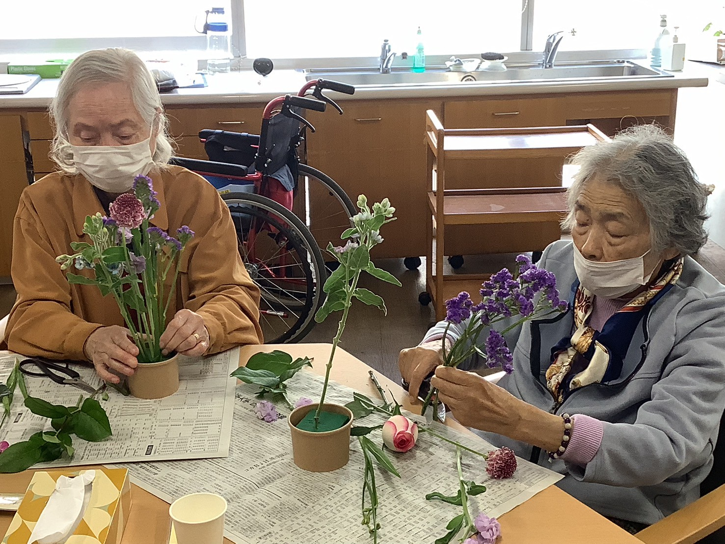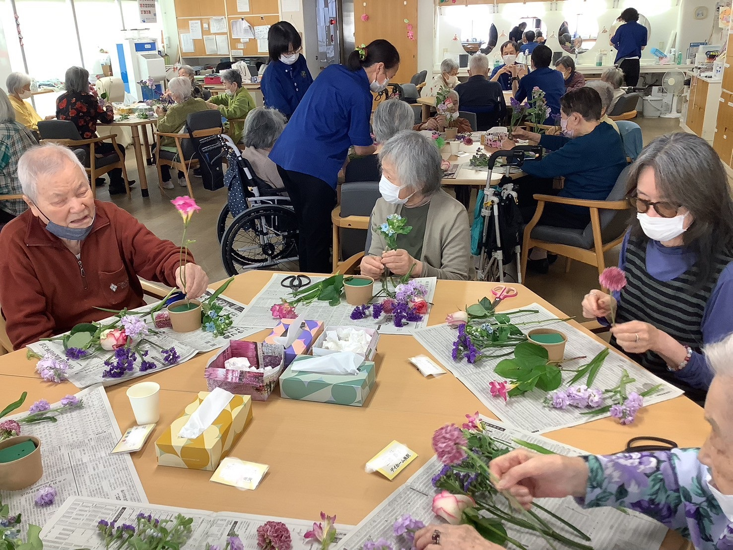 今日の午後は皆さまお待ちかね、フラワーアレンジメントに参加されています!!