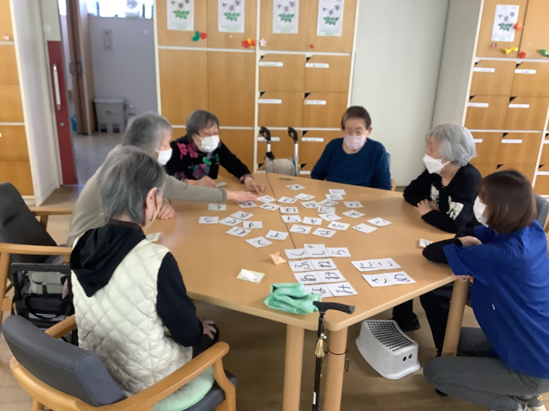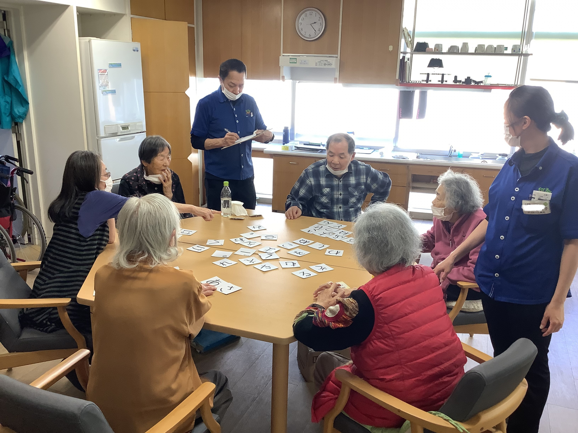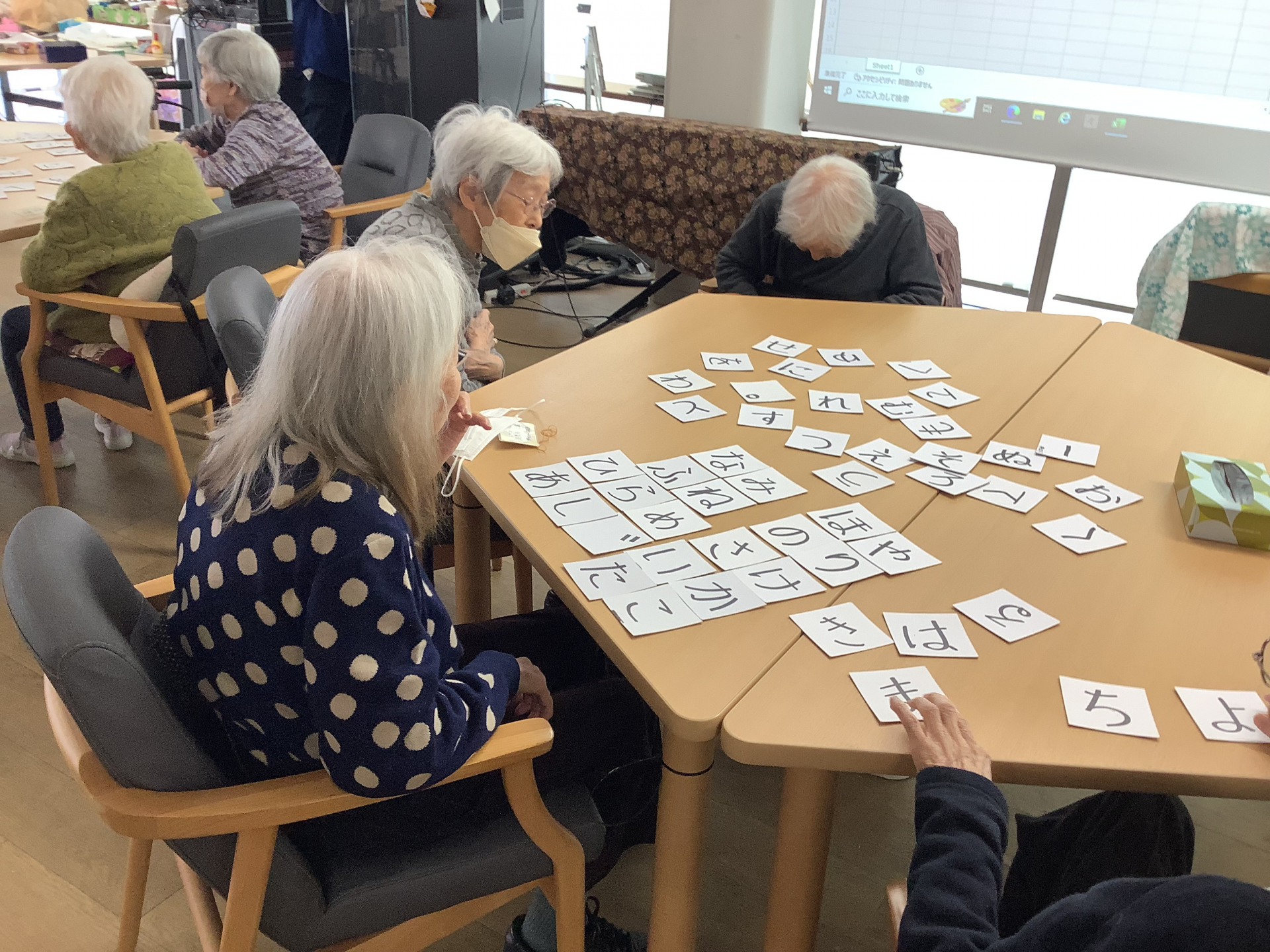 言葉作りゲームは職員がお題をだし、そのお題に合う、言葉を作っていただきます!!