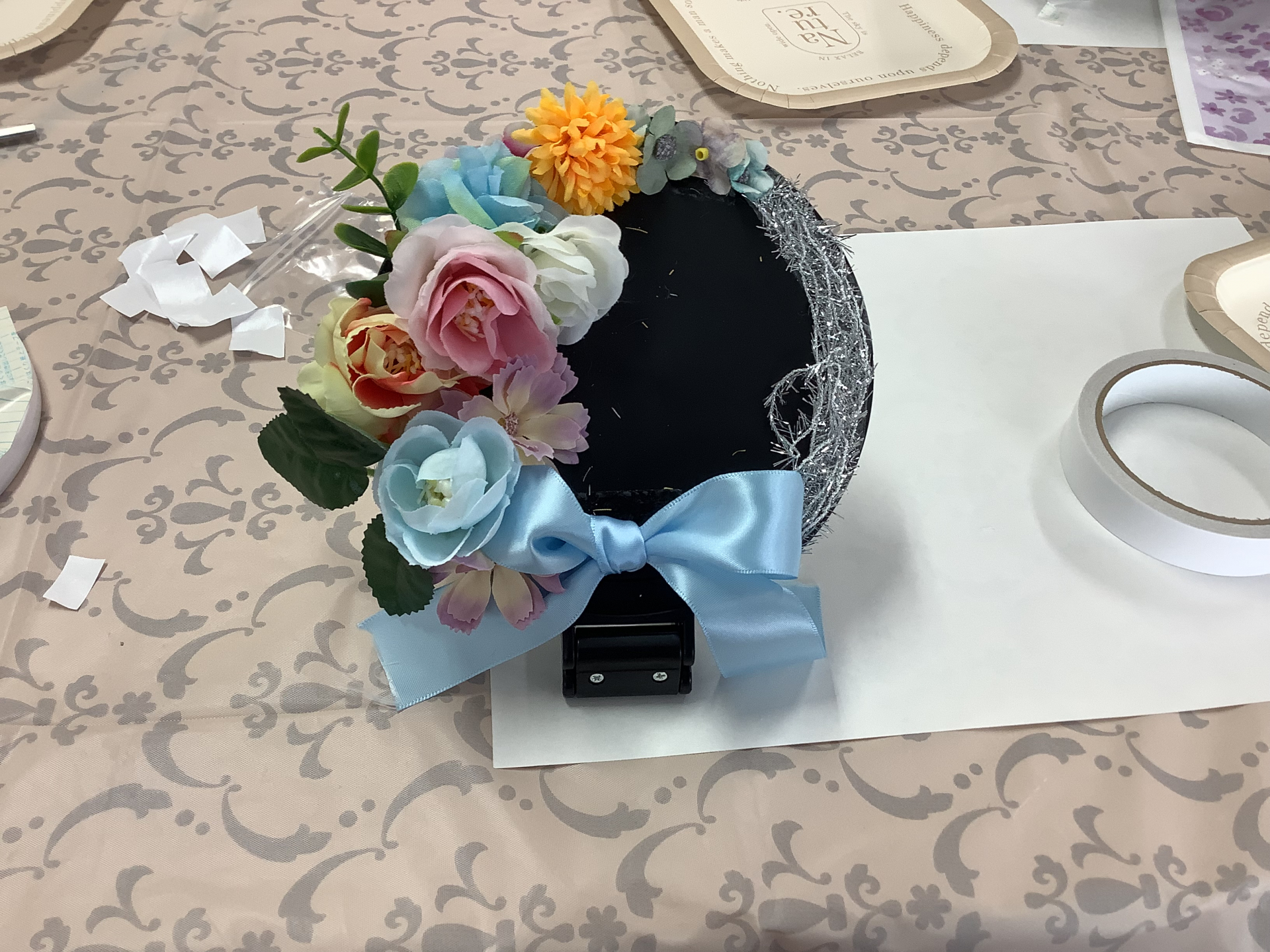 お花は両面テープで止めます!!お花が取れないように、花びらをしっかり止め、しっかりとデコります!!