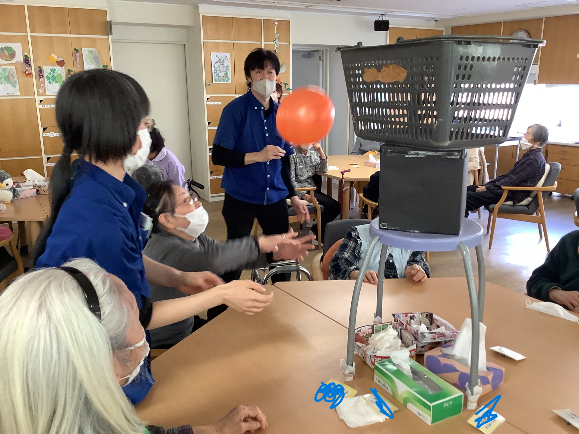 普通の風船バレーとは違い、真ん中のかごに入れたらポイントが入ります‼