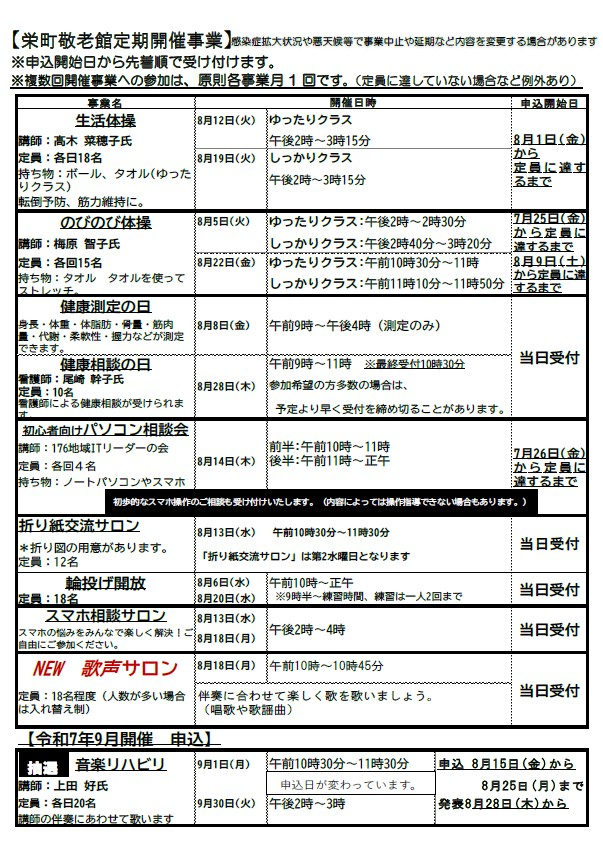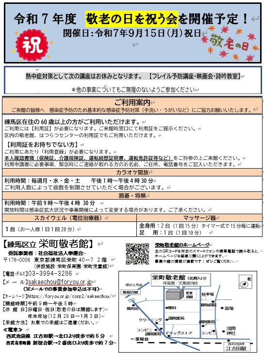 事業に関するお申込みやお問合せは、栄町敬老館までお願いいたします。