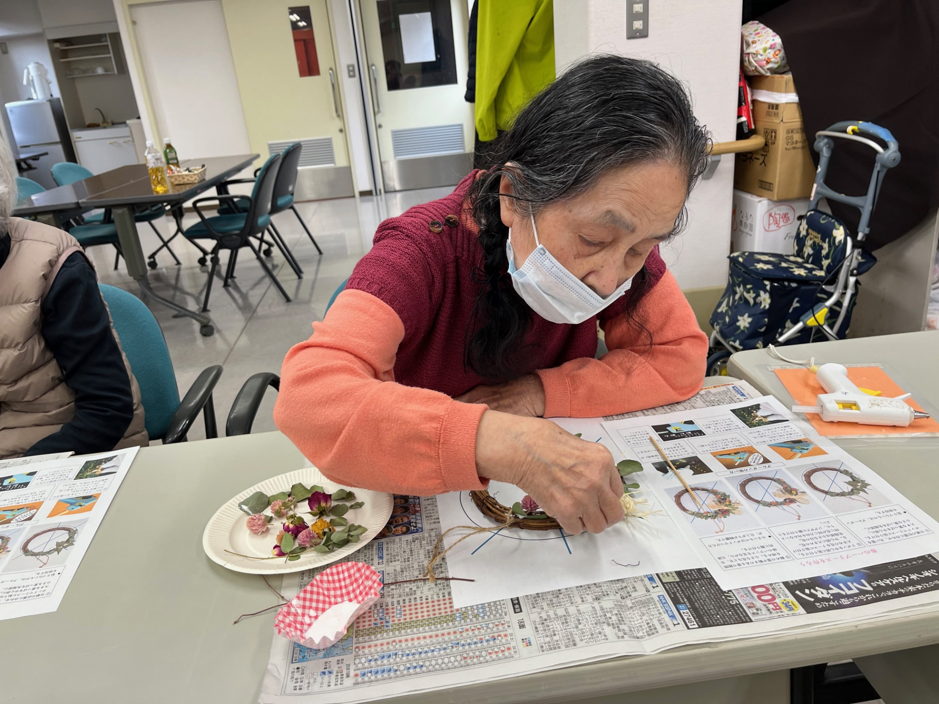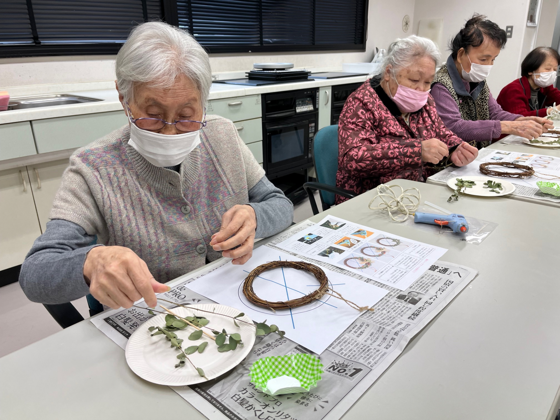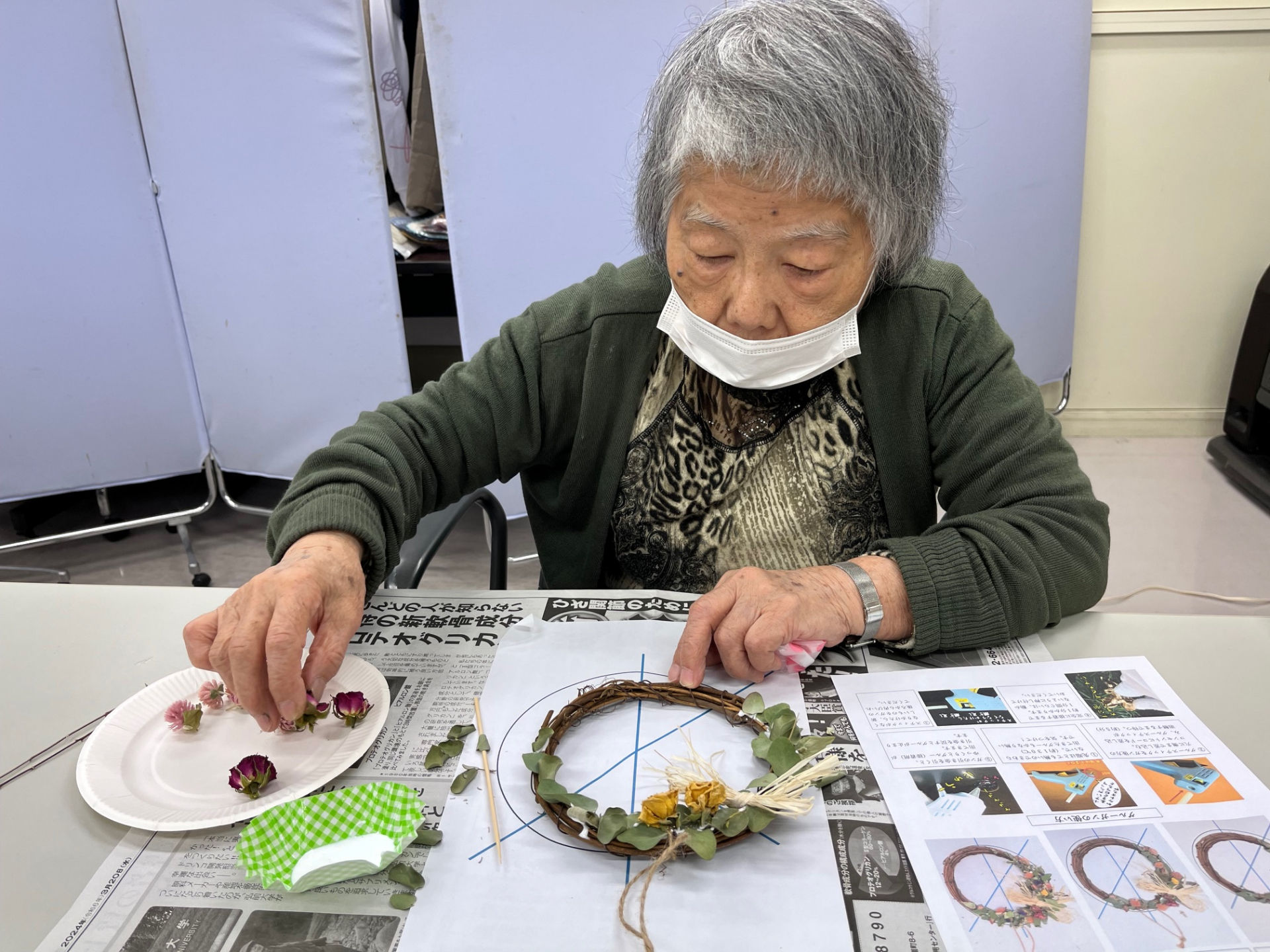 置き場所が決まったら葉っぱや花をリースに着けていきます