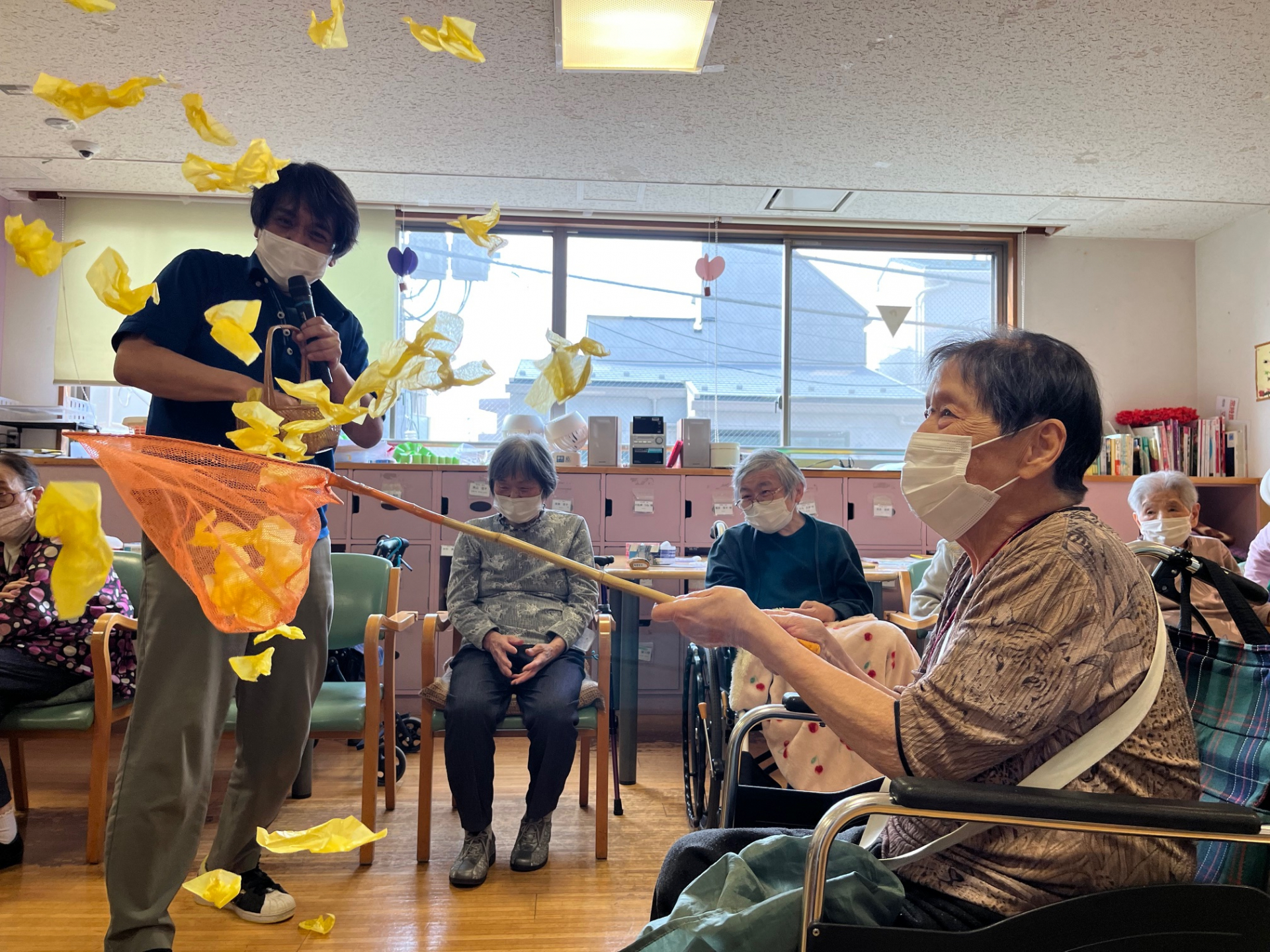 黄色の薄葉紙を蝶々に見立てて上から降ってくる蝶々をキャッチするという簡単なゲームです