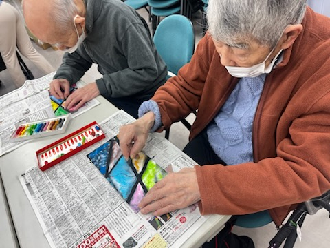 今回の臨床美術ではオイルパステルやクレヨンを使って作品を創作しました。