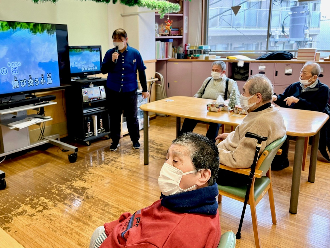 今日は笹幡の最年少の職員であるワタナベさんがご利用者様を楽しませるためにカラオケを歌ってくれました。