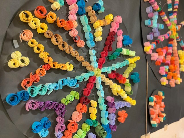 折り紙をくるくる巻いて、一つひとつ丁寧に貼り合わせていく作業は時間も根気も必要でしたが、出来上がってみると壁いっぱいに広がる大きな花火となり、とても華やかです。