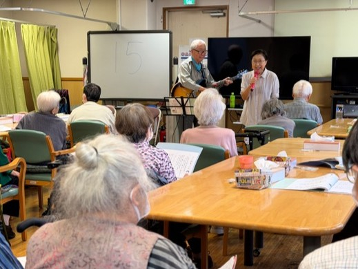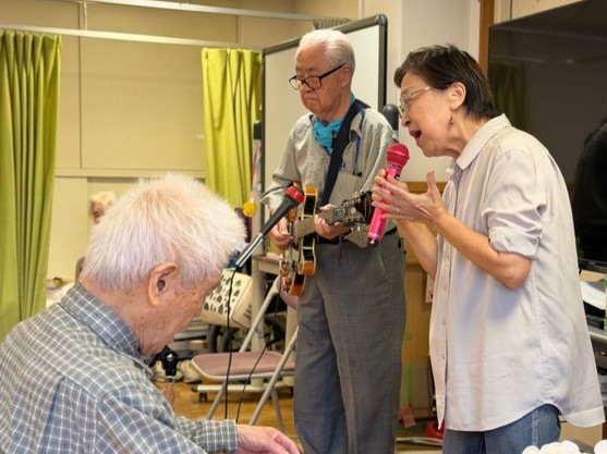 三宮先生とお仲間による生演奏に合わせて、利用者様が懐かしい歌を口ずさみます。「この曲、若い頃によく歌ったのよ〜」と、自然に声が弾むひととき (⁎˃ᴗ˂⁎)