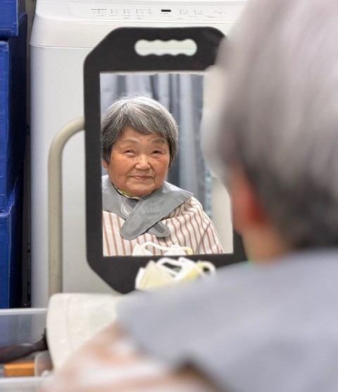 鏡の前に座るご利用者様は少し照れながらもとても嬉しそうなお顔。