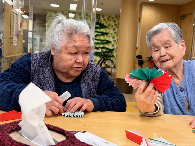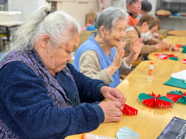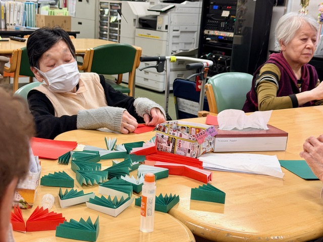 赤と緑の折り紙を丁寧に折って、ひとつひとつ形にしていく時間。