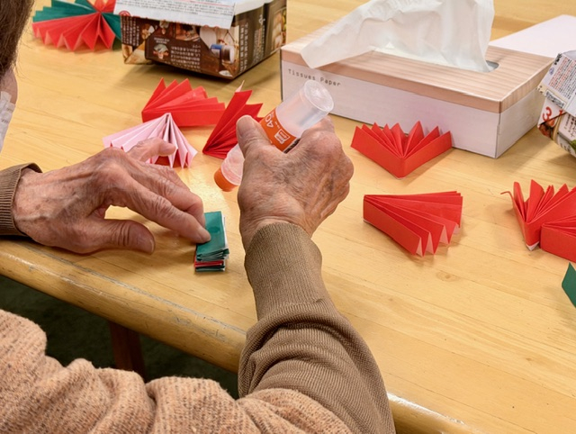 先週からレクリエーションの前に皆さんでクリスマスの飾り作りを始めました。