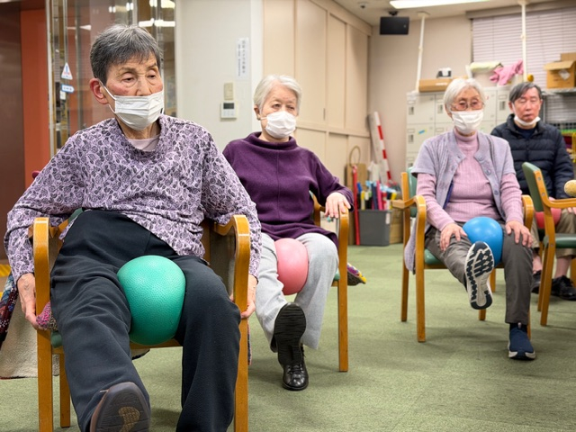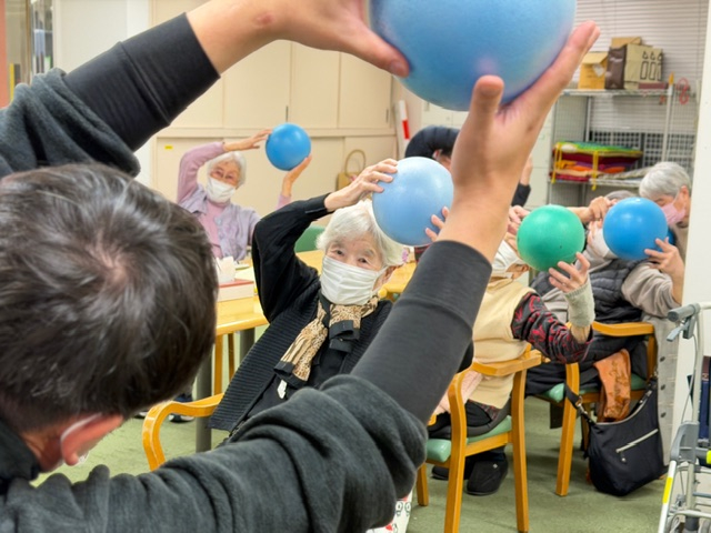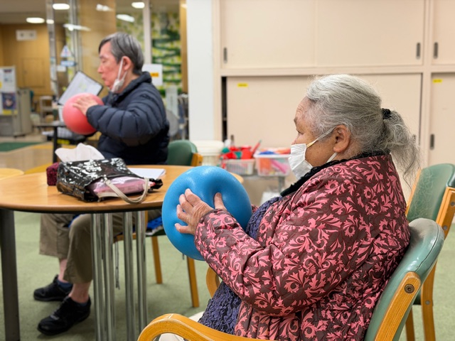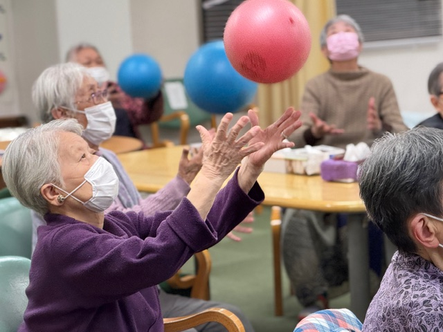 皆様がボールを手に取り準備が整うと、職員の合図に合わせて “ぎゅっ”、 “すーっ”、 “ぽーん” と、リズムよくボール体操が始まりました。