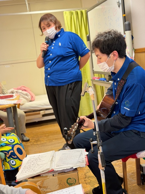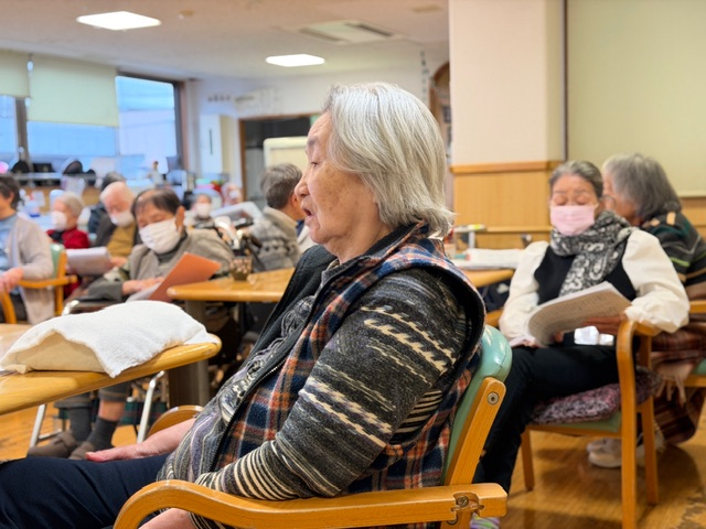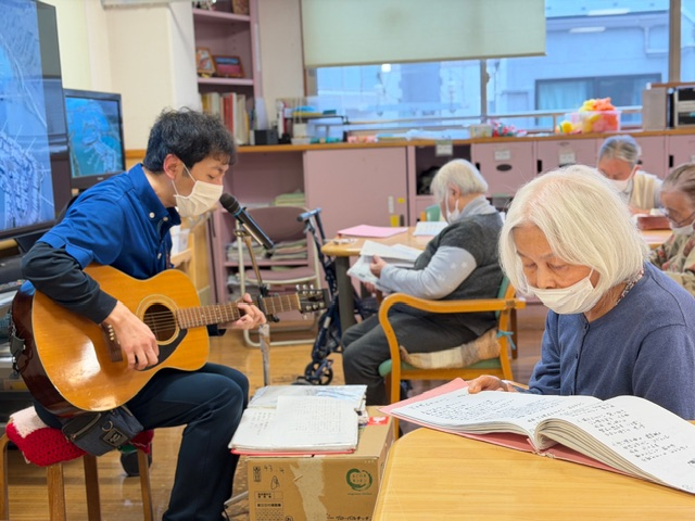 ギターを担当してくれた平嶋職員が静かにコードを鳴らし始めると、利用者様が手元の歌集をそっと開き、空気がふわりと柔らかく変わりました。
