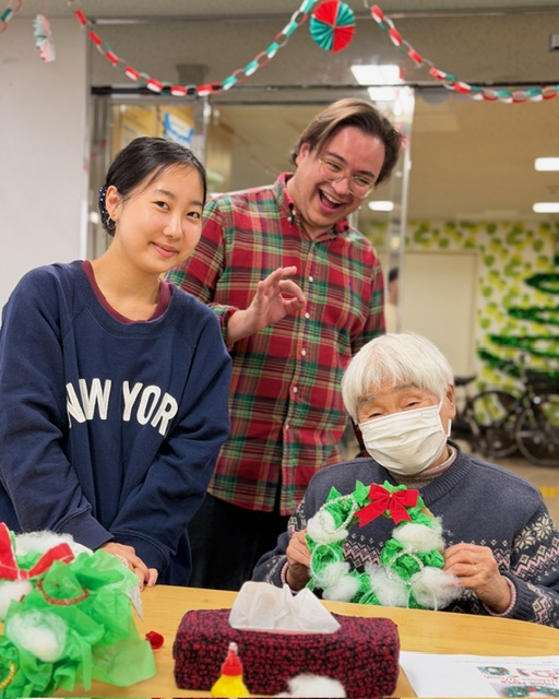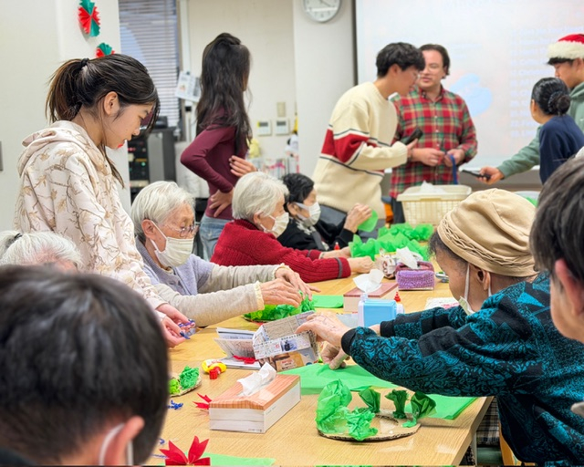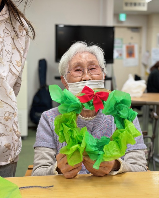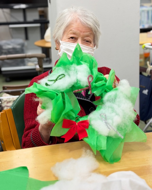 エバーグリーングループの生徒の皆さんと、ご利用者様が一緒になって取り組んだのはクリスマスリース作り 。