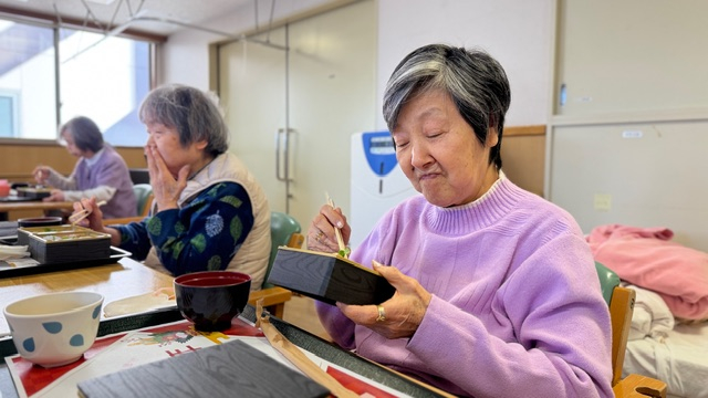 「お正月のごちそう」お一人おひとり、ゆっくり箸を動かしながら、「やっぱりすき焼きはいいねぇ」「お正月らしくて嬉しいわ」