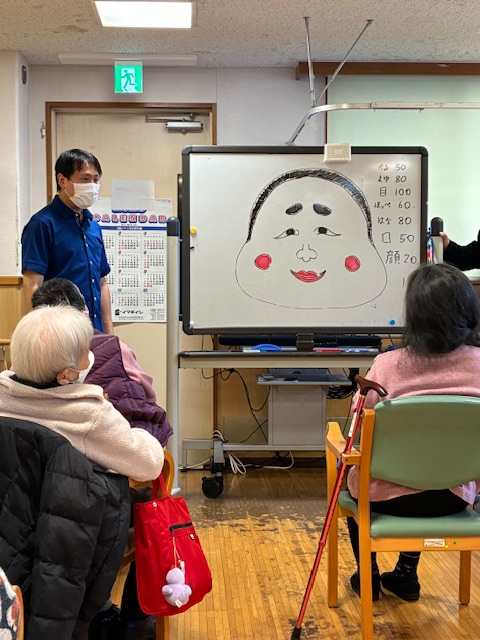 本日はホワイトボードに描かれたおたふくさんの的を狙って、バンダナを巻いた磁石を投げるダーツを行いました。おたふくさんの表情がとっても可愛らしいですね!