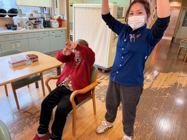 椅子に座ったままの体操では、職員の見守りのなか、動きを一つひとつ確認しながら、安心して取り組めるよう声をかけています。