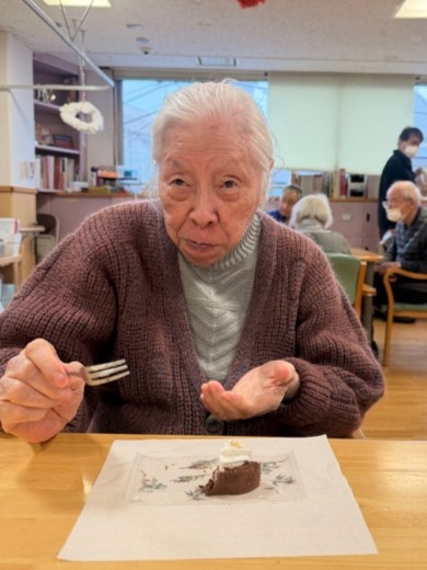ケーキを一口食べて「おいしいね」と笑顔。