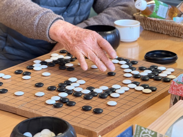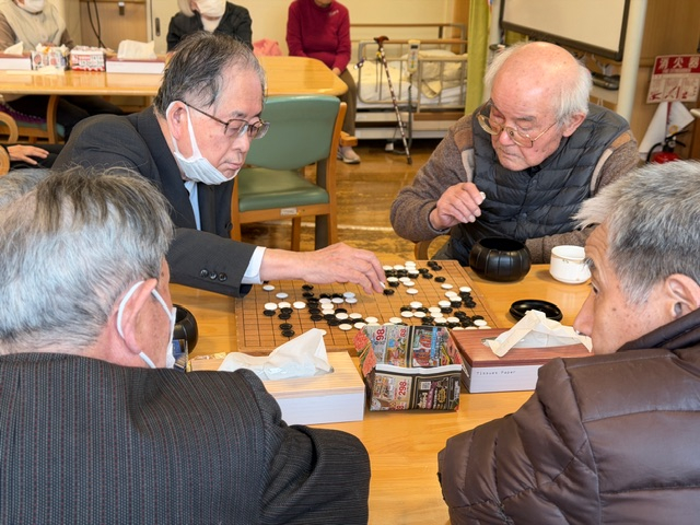 午後のフロアでは、男性利用者様たちが集まり、囲碁の対局が始まっていました。