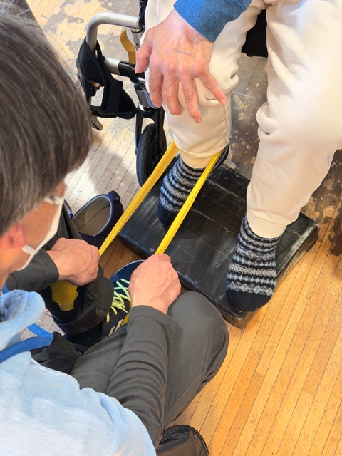 椅子に座った状態で足を前に伸ばしたり、ゴムバンドを使った運動など、