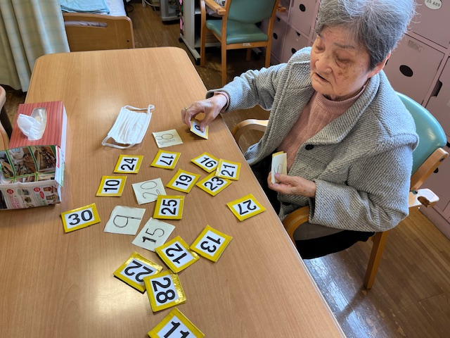 E様は数字を並べるカードゲームに職員と挑戦されており、
