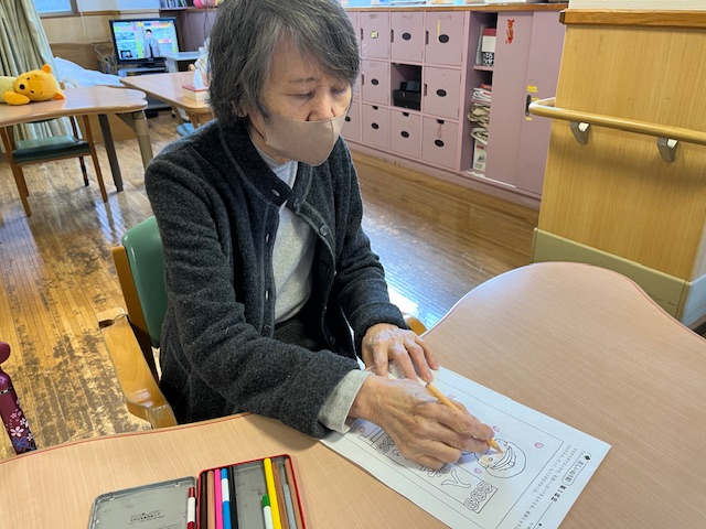 O様も「ここは何色にしようか?」と配色に悩みながらも丁寧に塗り絵を仕上げていきます