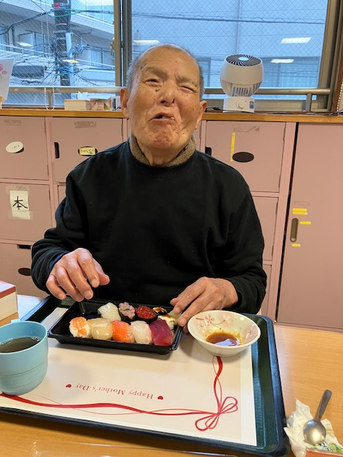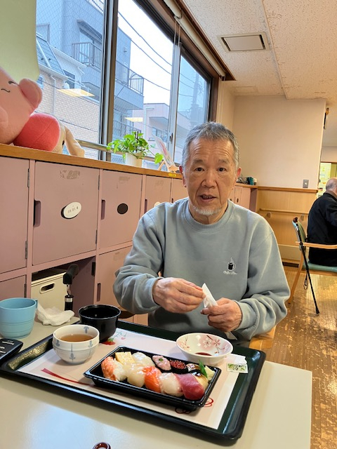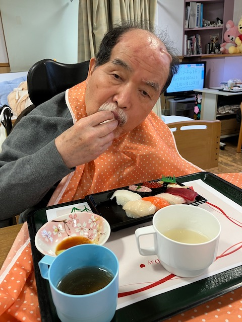 「回らないお寿司だね」と職員と楽しそうにお話されながらお召し上がりいただきました