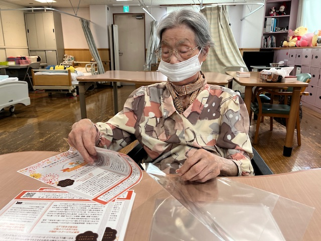 うららフロアでもプロジェクト準備に参加し、チラシとオレンジ色の花のキバナコスモスの種を梱包していただきました