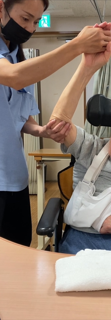 F様と奥様にはリハビリを行う上ではっきりとした目標があるため、私たち職員も訪問リハビリの方と協力しデイでできる動きを教わったりしています