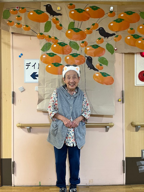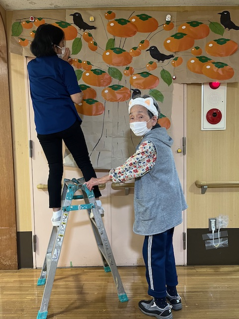 完成した壁飾りの前を通る利用者様は「私はあの柿が食べたい」「カラスが狙っているね」と足を止めて楽しそうにお話されたりとたくさん感想が聞こえました