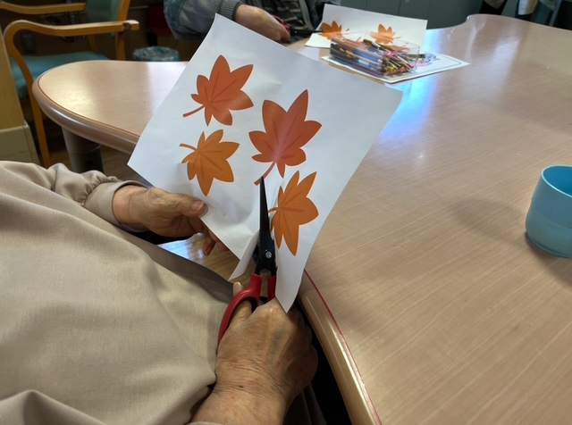 午後は秋の壁飾りづくり。紅葉の色紙をちぎり貼りしながら、「昔はよく紅葉狩りに行ったね」と
