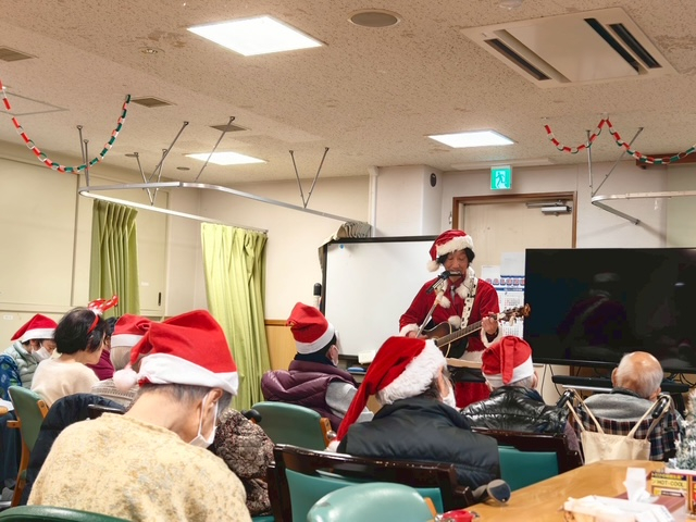 やさしいギターの音色がフロアいっぱいに広がり利用者様も自然と笑顔に