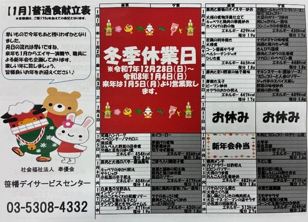 【笹幡認知デイ】1月の献立☆