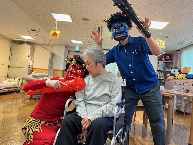 職員が変装した赤鬼青鬼の登場に最初は驚かれながらもすぐに笑顔に