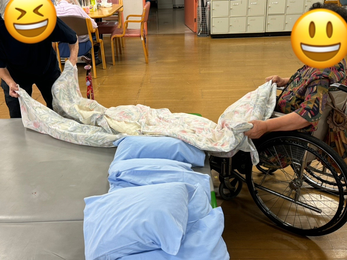 2024.08.29 デイサービス お手伝いレンジャー Tweet シェアする こんにちは、せせらぎデイサービスの郷です。 I様、N様布団と枕交換をお手伝いしてくれました! 毎週木曜日はお手伝いしてもらい、とても助かってます♪ 前の記事 2024.09.01 デイサービス 絵手紙 次の記事 2024.08.25 デイサービス 納涼祭! 一覧へ戻る