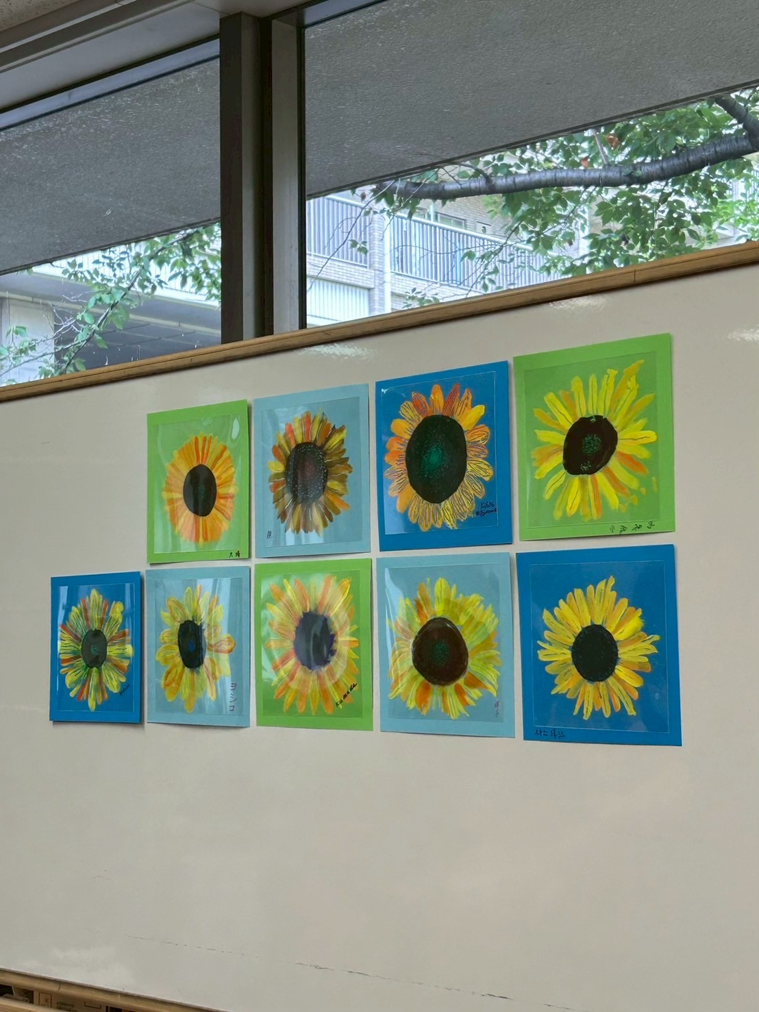 ガラス絵技法という方法で、台紙いっぱいに大きなヒマワリを咲かせました🌻