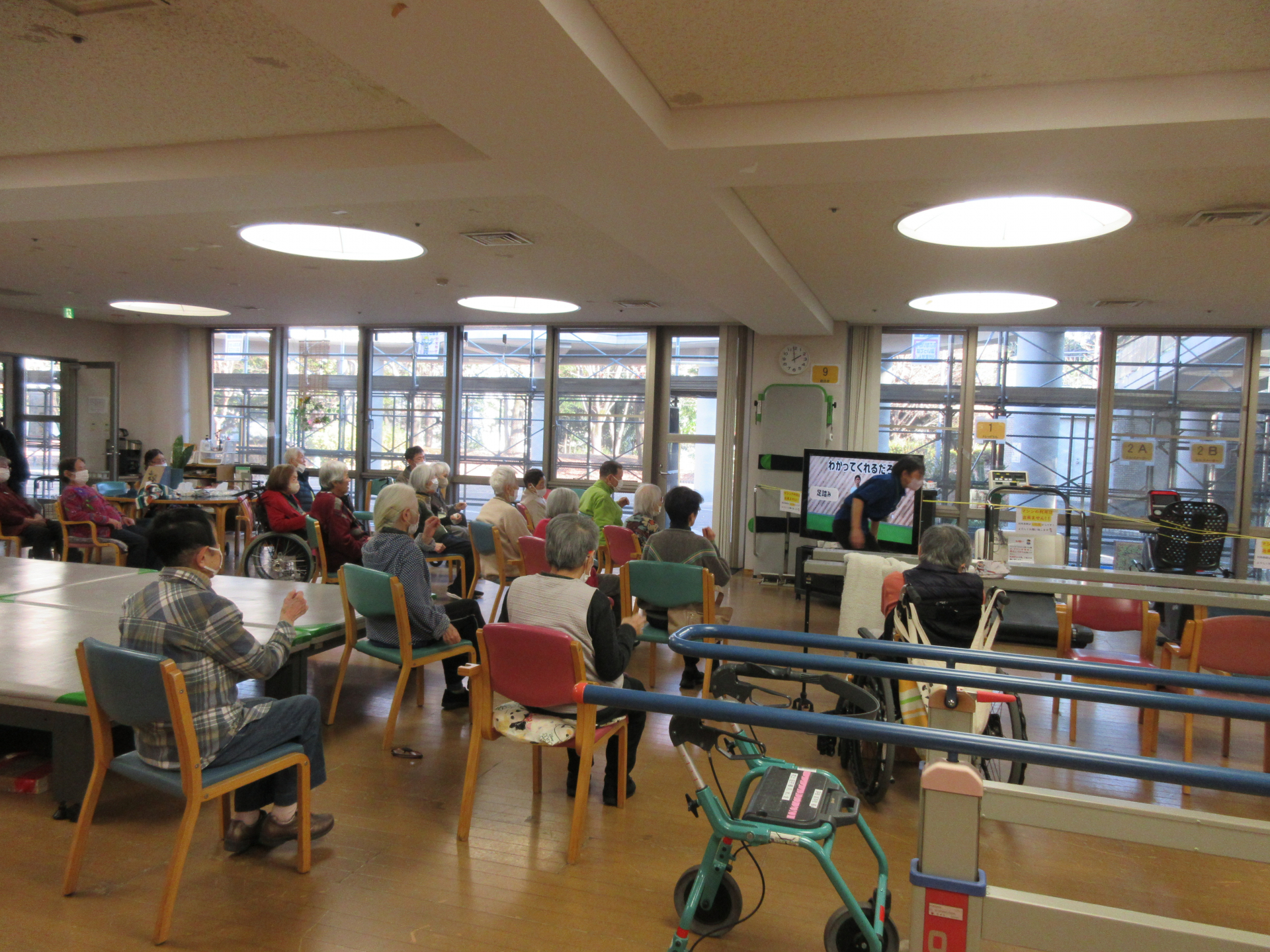 寒暖差や乾燥で、のどの違和感から咳が誘発されます。こまめな水分補給とうがいに努めましょう‼ マスクの着用で加湿も期待できますよ! 今日は年末で人数は少なめですが、みなさん、熱心に運動されています。