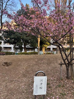 ほのぼのクラブの窓の外には広い庭が広がっております。つい最近、そこに河津桜